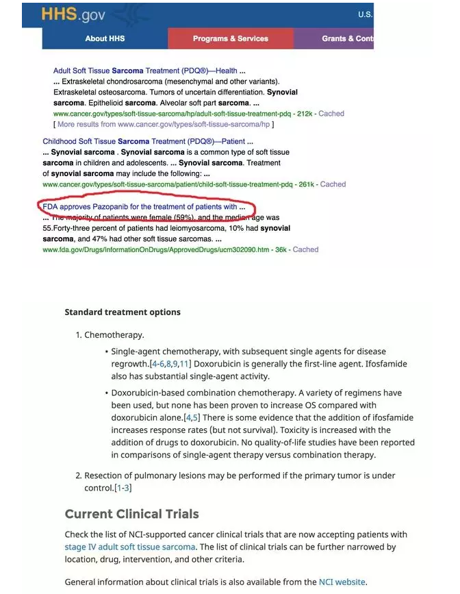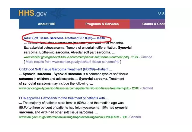 但如果我登錄美國(guó)衛(wèi)生及公共服務(wù)部HHS.gov,搜索關(guān)鍵詞“Synovial sarcoma”(滑膜肉瘤)。