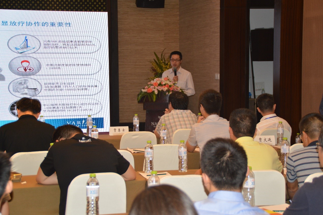 (深圳醫(yī)諾產(chǎn)品經(jīng)理賈文廷先生會上介紹深圳醫(yī)諾攜手國際醫(yī)療巨頭瓦里安公司共同打造的“安諾云智”放療技術協(xié)作平臺及其質(zhì)控應用)
